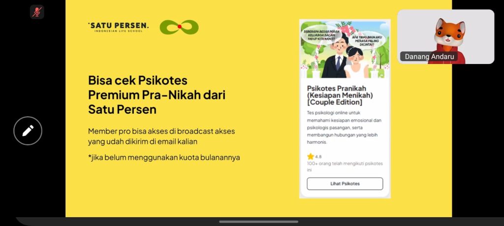Sebagai penutup, disampaikan ajakan untuk terus meningkatkan kesadaran akan kesehatan mental dan relasi, serta memanfaatkan layanan psikotes dan konseling yang disediakan oleh Satu Persen dan kawan seperjalanan sebagai bentuk dukungan bagi perkembangan pribadi dan hubungan yang lebih sehat.