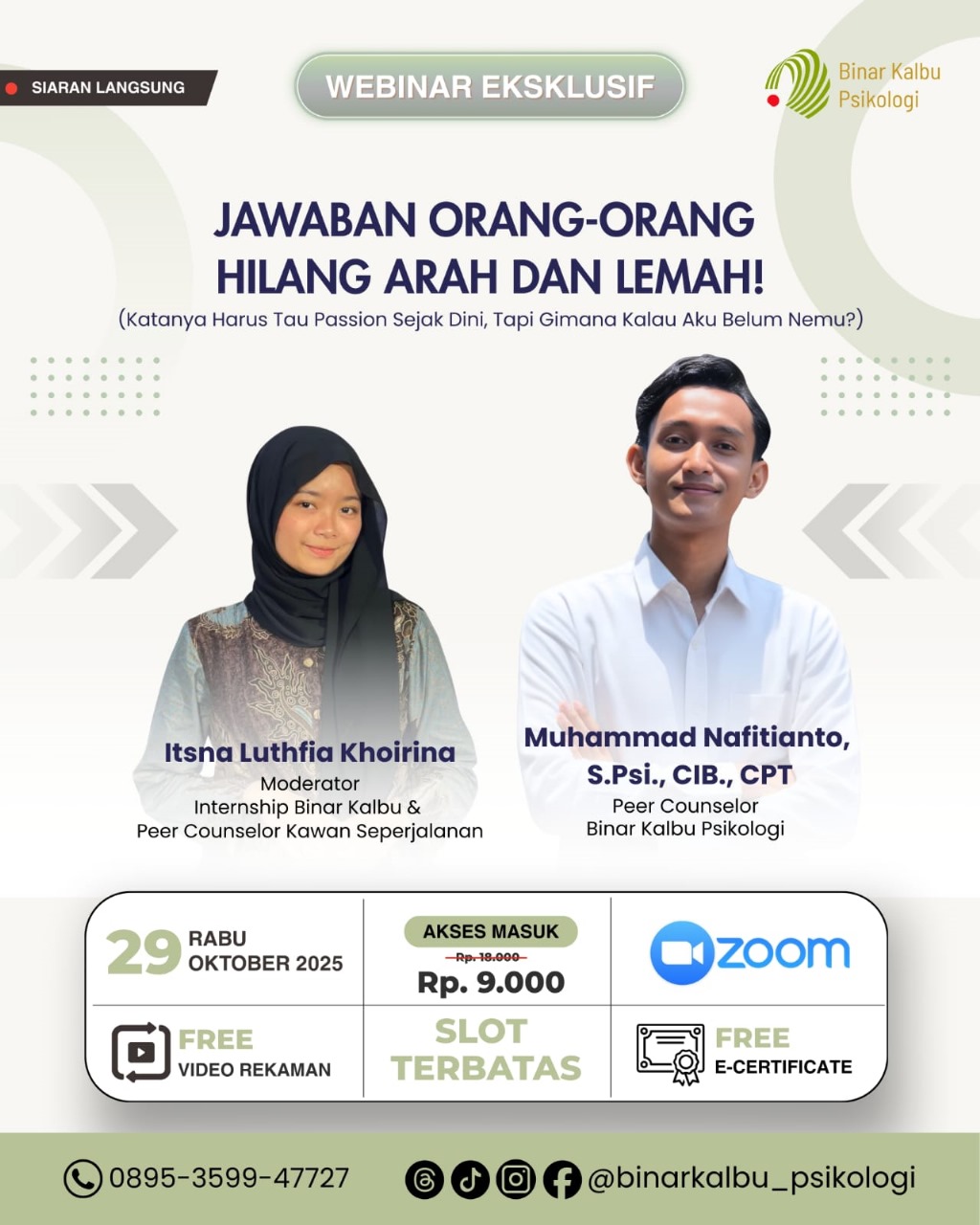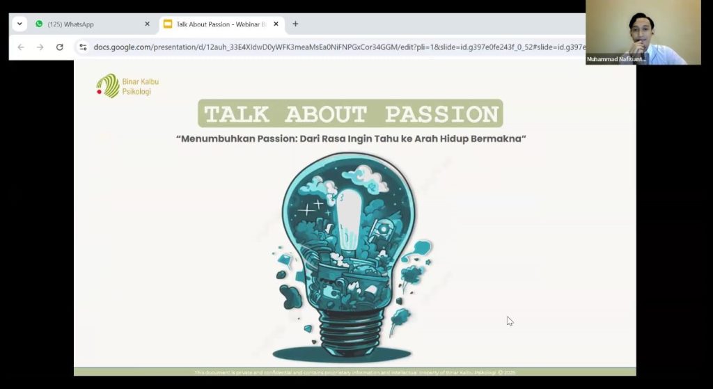 Webinar bertema “Jawaban orang-orang hilang arah dan lemah” berlangsung dengan hangat dan interaktif. Acara ini berfokus pada pemahaman bahwa passion bukanlah sesuatu yang lahir secara alami, melainkan sesuatu yang tumbuh melalui eksplorasi, usaha, dan refleksi diri yang berkelanjutan.